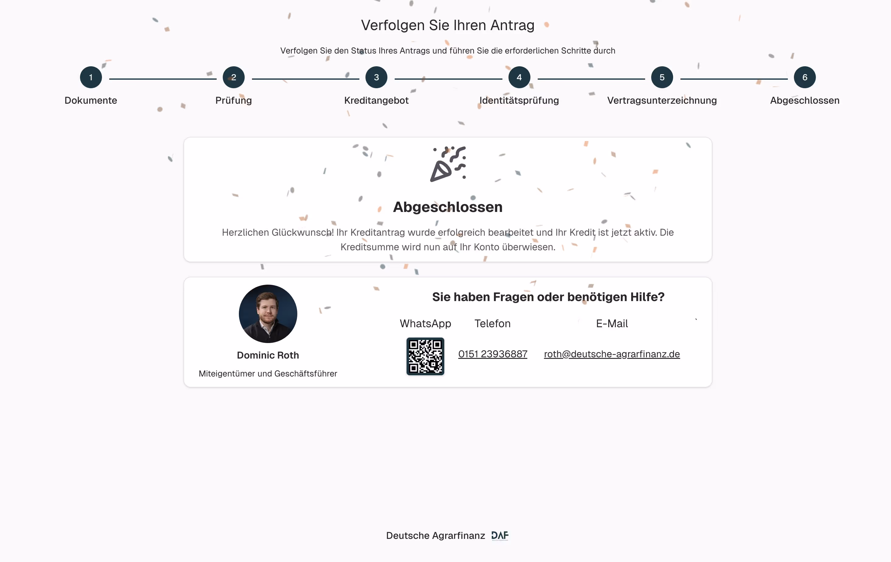 Nach einem persönlichen Gespräch können Sie den Antrag bei Bedarf einfach online abwickeln.. Erleben Sie, wie einfach und transparent die digitale Kreditbeantragung ist. Verfolgen Sie jeden Schritt Ihres Antrags in Echtzeit und behalten Sie stets die volle Kontrolle. Jeder Schritt ist darauf ausgelegt, Ihnen maximale Transparenz und Kontrolle zu geben. Wir sind selbstverständlich trotzdem zu jedem Zeitpunkt persönlich für Sie verfügbar. Auch am Wochenende!